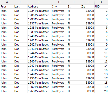 - Next, consider adding a UID column. The UID column assigns a unique number to each customer record, ensuring consistency even if the file’s output varies. For instance, if your "John Doe" record was submitted in column 1, our system might occasionally reassign it to a different column in the output. Regardless of the column it appears in, as long as a UID number is assigned, you can reorganize the data by this column to match the original input.